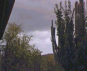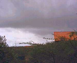 completely covered with dark clouds and on the floor you see, that it has even rained!
