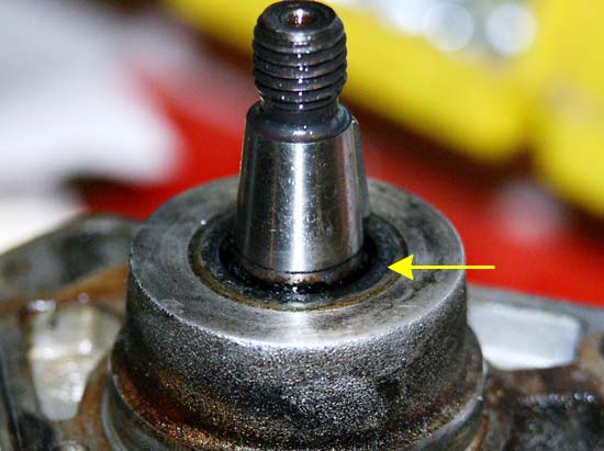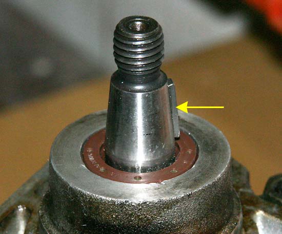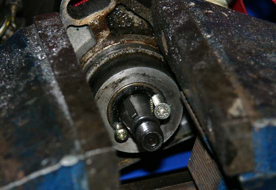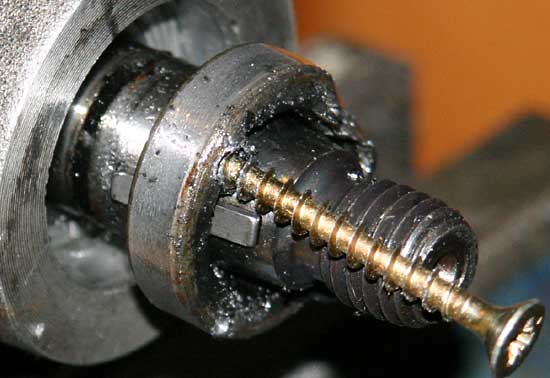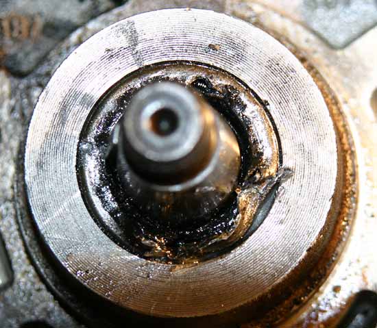 Was ist eigentlich hinter dem Wedi? Das Lager der Welle. Mehr nicht. Man sieht hier auch, dass ich die Schrauben wohl etwas zu tief rein gedreht hatte. Der Kratzer macht aber nichts. Dieser Bereich wird natürlich penibel gesäubert. (Hoffentlich sind beim Bohren keine Späne in das Löchlein oben gefallen!) Die Welle muss untersucht werden, ob der alte Wedi Schleif-Spuren hinterlassen hat. Die Welle ist dann "eingelaufen". |